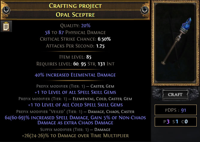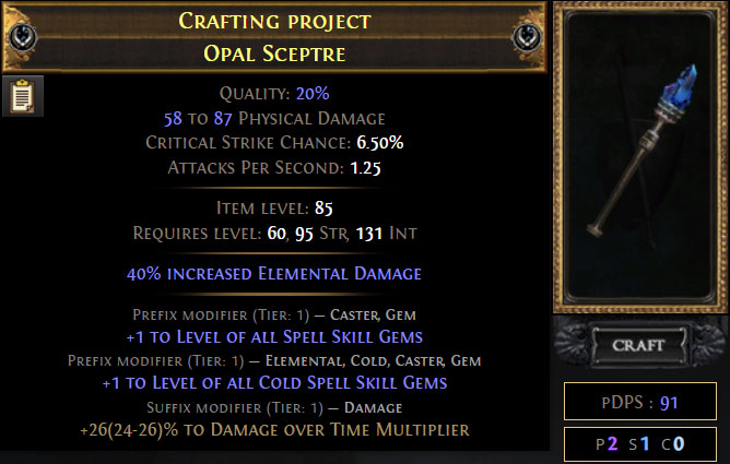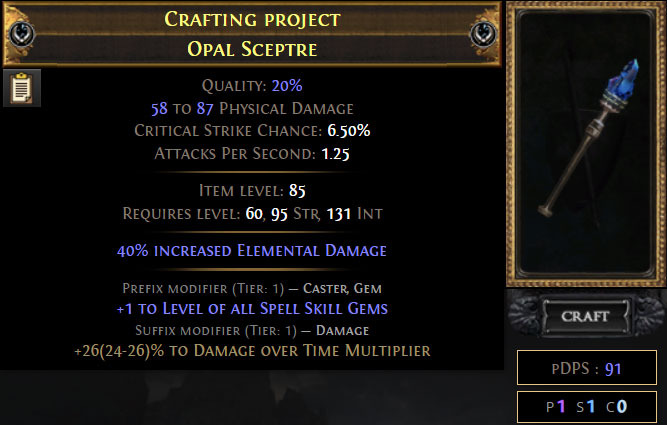 그리고 우리가 목표로 하는 모든 옵션을 고려할 때 아이템 레벨은 82가 이상적이겠으나, 현실적으로 가장 이상적인 조건을 만족한 베이스 매물을 구하는 것이 아주 어렵기 때문에 아이템 레벨 82 이상인 매물 중에서 고정 옵션이 적당한 매물로 골라보겠습니다. 저는 '지속 피해 배율' 접미어 옵션이 분열고정된 아이템 85레벨의 오팔 셉터를 구했다고 가정해보겠습니다.
