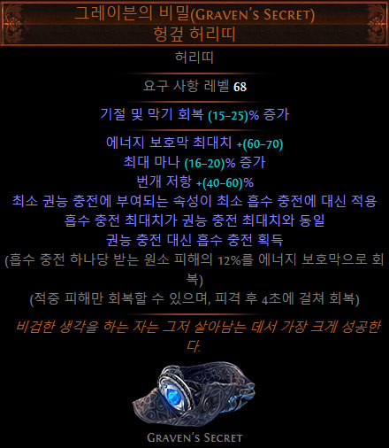 충전 효과를 크게 공격과 방어 측면으로 나누었을 때, 격분·권능 충전이 공격에 유용하고 인내 충전이 방어에 유용하다는 옵션을 변형해 인내 충전까지도 공격에 가담할 수 있도록 해주는 옵션이 바로 안의 비통 허리띠에 있는 '최소 인내 충전에 부여되는 속성이 최소 잔인 충전에 대신 적용' 옵션이다.
