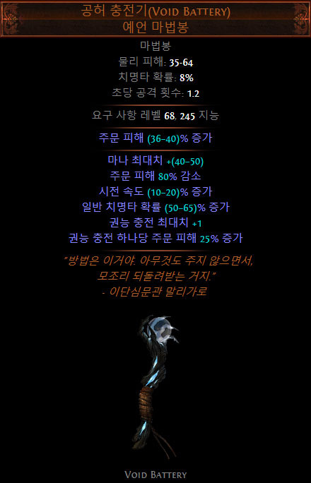 주문 빌드에서는 공허 충전기를 사용할 수 있다. 권능 충전 하나당 주문 피해 증가 옵션을 충분한 효율로 활용한다면, 기본 옵션의 '주문 피해 80% 감소' 옵션은 그다지 신경쓸 필요가 없게 된다.